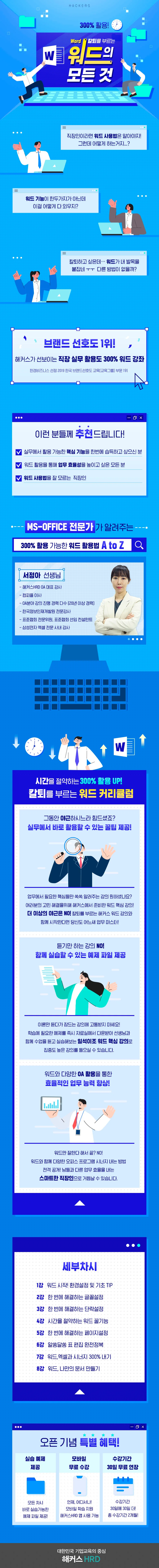 오늘도 문서작성이 걱정인 여러분들께 해커스가 준비했습니다. <300% 활용! 칼퇴를 부르는 워드의 모든 것> 업무에 꼭 필요한 워드 기능들만 모아서 구성한 핵심 강좌입니다. 1. 본 강의는 Word2019버전을 사용하였으며, 다른 버전에서도 문제 없이 수강하실 수 있도록 구성하였습니다. 2. 학습에 필요한 예제는 자료실에서 다운로드 가능합니다. |