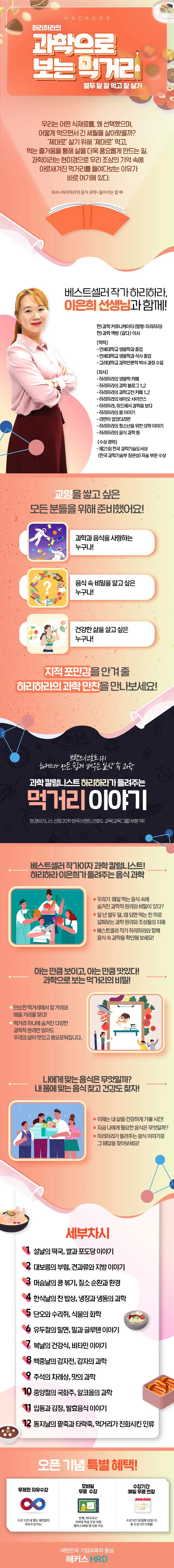 | 학습개요 | 과학 분야 베스트셀러 작가이지 과학 칼럼리스트인 하리하라 이은희가 들려주는 음식 속에 숨어있는 과학이야기 |